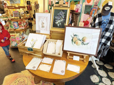 - A selection of artist Corrissa Flesher’s watercolor art for sale on display in the Marietta Makery. (Photo by Amber Phipps)