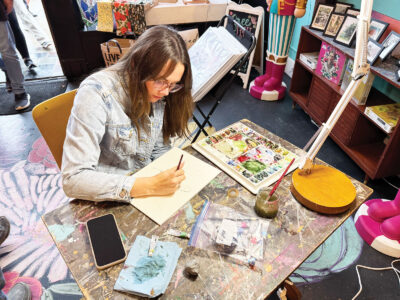 - Corrissa Flesher at the entrance of the Marietta Makery where guests watched her paint with watercolors during First Friday on Friday in Marietta. (Photo by Amber Phipps)
