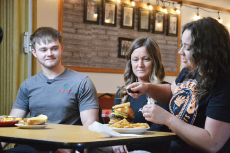 Ohio Redwood Head Chef Bailey Null and owner Desiree Kerns watch on Monday as “America’s Best Restaurant” host Ashley Dawn tries the restaurant’s biggest dish, the Tall Boy Burger, consisting of four beef patties, two slices of cheese and toppings. (Photo by Douglass Huxley)