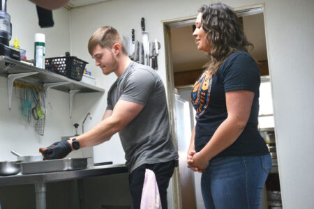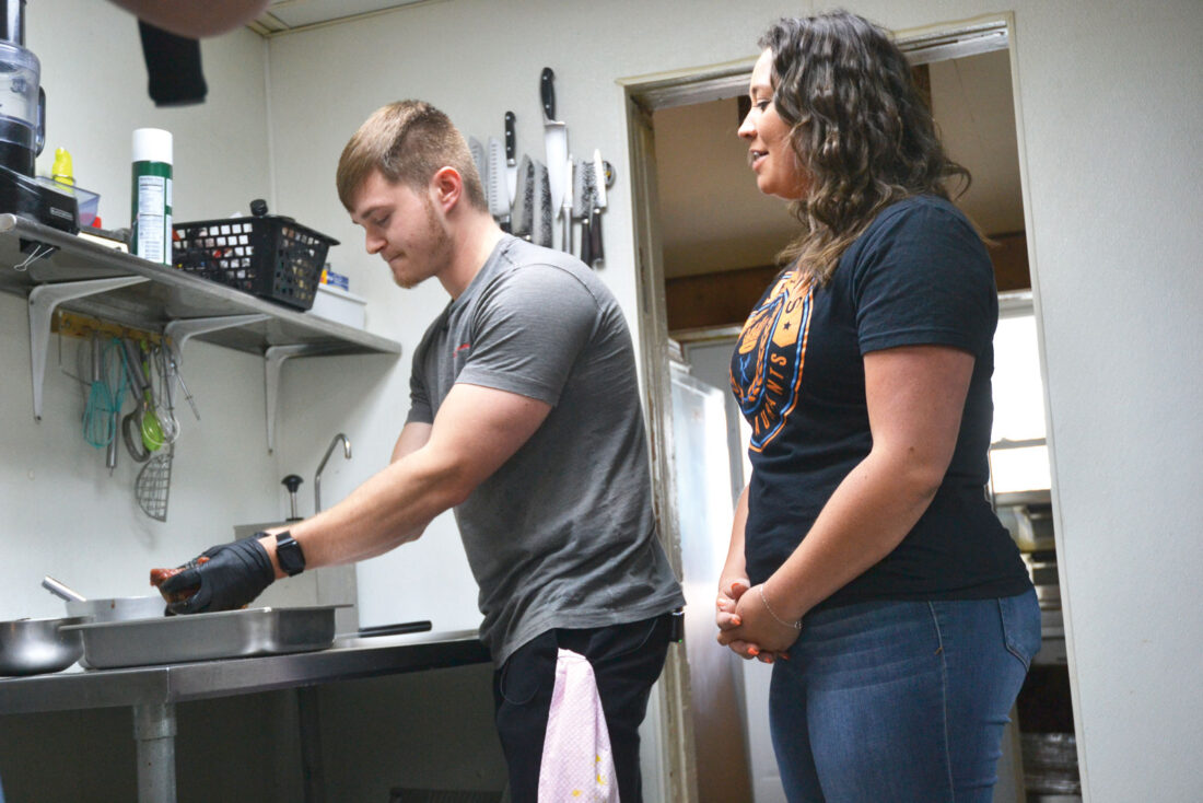 Ohio Redwood Head Chef Bailey Null shows “America’s Best Restaurant” host Ashley Dawn how to prepare the Belpre restaurant’s signature ribs. Null said the ribs spend hours baking in a secret blend of spices to get the flavor just right. (Photo by Douglass Huxley)