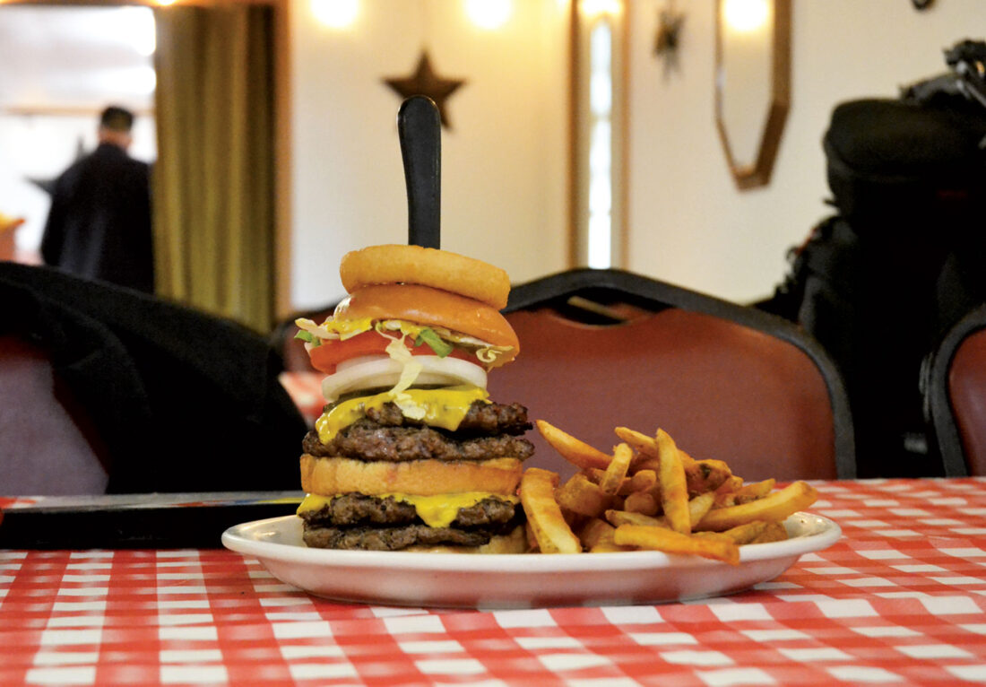 Head Chef Bailey Null prepared three meals for Dawn to sample: the restaurant’s signature ribs, the three-egg western omelet and the Tall Boy Burger, consisting of four beef patties, two slices of cheese and toppings that come with a steak knife to help keep it together.