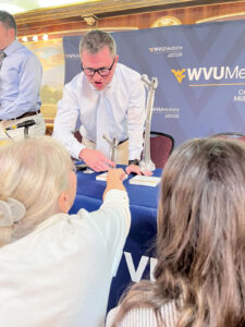 - Dr. Lunden Ryan, orthopedic trauma surgeon at WVU Medicine Camden Clark Medical Center, provides a one-on-one demonstration to event attendees following the Dinner with the Docs event Tuesday at the Lafayette Hotel. (Photo Provided)