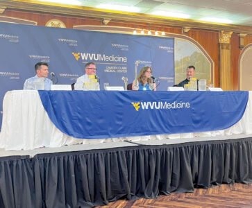 - From left are the panelists from Tuesday’s WVU Medicine Camden Clark Medical Center Dinner with the Docs event: Dr. Alexander Conti, MD, orthopedic trauma surgeon; Dr. Lunden Ryan, orthopedic trauma surgeon; Physician Assistant Casey Brunetti, pain management specialist; and Chad Corliss, doctor of physical therapy and orthopedic physical therapist. (Photo Provided)