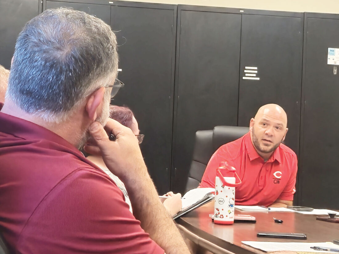 - Marietta City Councilman Bret Allphin suggests striking the term ‘mandamus’ from resolutions 79 and 80 at a Water and Sewer Committee meeting Tuesday at 304 Putnam St. (Photo by Gwen Sour)