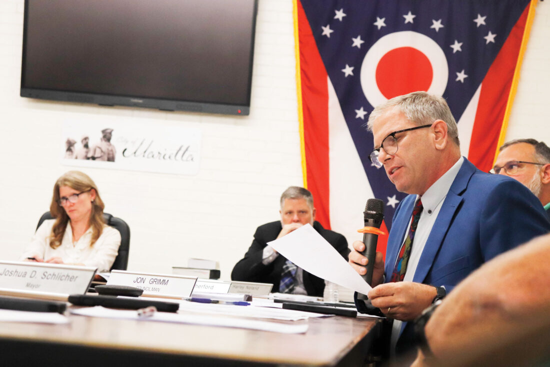 - Councilman Jon Grimm updates council on communications he received from the Ohio Department of Natural Resources during Thursday’s Marietta City Council meeting. (Photo by Gwen Sour)
