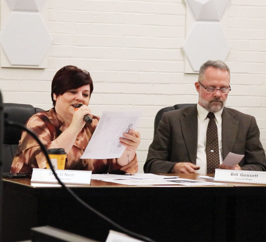- Councilwoman Erin O’Neill, left, gives a statement thanking her fellow councilors for their efforts on the resolutions surrounding injection wells and thanks attendees for their concern regarding the issue at Thursday’s Marietta City Council meeting. (Photo by Gwen Sour)
