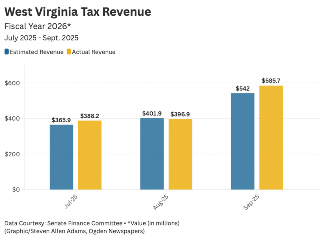 CHARLESTON — Tax collections for West Virginia’s general revenue fund in September came in above estimates for the month, reversing a slight decline and adding to a small by growing surplus. According to reports released Wednesday by the state Department of Revenue and the Senate Finance Committee, September tax collections for fiscal year 2026 were $585.7 million, which was more than 8% above the $542 million estimate set by the state Department of Revenue, providing the state a $43.7 million surplus for the month. September revenues were also 3.2% above the $567.7 million in collections in September of last fiscal year. Year-to-date tax collections for the first three months of the current fiscal year were more than $1.370 billion, or 4.7% above the $1.310 billion revenue estimate, taking the total general revenue surplus to nearly $61 million. “I’m encouraged by the state’s financial performance over the first quarter of this year,” said Gov. Patrick Morrisey in a statement Wednesday afternoon. “We are beginning to see the results of difficult decisions I made earlier in the year – partnering with the Legislature to enact a fiscally conservative budget and driving program efficiencies across my administration.” The Legislature passed — and Morrisey signed — a $5.323 billion general revenue budget for fiscal year 2026, which began on July 1. That balanced budget came following projections by Morrisey’s revenue officials in January that the state would see a nearly $400 million gap in fiscal year 2026 spending versus revenues in an early six-year budget forecast. With the $61 million in surplus collections, that state is sitting on more than $200 million in unappropriated money in the general revenue fund, as well as $1.374 billion in the state’s two revenue shortfall reserve funds (called the Rainy Day Fund) and $460 million set aside in the personal income tax reserve fund. Work has already begun on crafting the fiscal year 2027 general revenue budget, which Morrisey will present to lawmakers in January during the regular 60-day legislative session. “While the State still faces some long-term budget challenges and other fiscal uncertainties, I am optimistic that our hard work will result in West Virginia being on a solid financial trajectory moving forward and allow us to return more money back to our people,” Morrisey said. Collections for the state’s four largest drivers of tax revenue – the personal income tax; the severance tax on coal, oil and natural gas; the consumer sales and use tax; and the corporate net income tax – were all above estimates. Personal income tax collections and severance tax collections led the way in collections for September. Personal income tax collections for September were $247.6 million, 6.8% more than the $231.8 million revenue estimate, providing a $15.8 million surplus. September income tax collections were also 3.5% better than September 2024 collections of $239.3 million. Fiscal year-to-date personal income tax collections of $539.1 million were 5.9% above the $509.2 revenue estimate for a $29.9 million surplus. That’s with the 2% and 4% income tax rate cuts that went into effect at the beginning of January 2025, on top of the 21.25% income tax cut that went into effect in calendar year 2023. “Our fiscally responsible approach of managing our state’s expenses while working to return more money every year to the taxpayers is working” said Senate Finance Committee Chairman Jason Barrett, R-Berkeley. “In 2023, we cut the state’s personal income tax rate by 21.25%, and because of strong financial conditions we’ve met since then, we’ve cut it by another 6 percent.” September severance tax collections of $51.7 million were 46% more than the $35.4 million revenue estimate for a $16.3 million surplus for the month. However, fiscal year-to-date severance tax collections of $82.2 million were nearly 9% below the $90.3 million revenue estimate for July, August, and September combined. The consumer sales and use tax brought in $173 million in September, or 4.4% above the $165.8 million revenue estimate for a nearly $8 million surplus for the month. Fiscal year-to-date sales tax collections of $489.6 million was 3.6% above the $472.5 million estimate, adding $17.1 million to the fiscal year-to-date surplus. Corporate net income tax collections in September came in just in the black, bringing in $60.2 million for the month, or nearly 0.6% above the $59.9 million estimate. Fiscal year-to-date corporate net income tax collections of $82.1 million were 10.7% above the $74.2 million estimate, adding $nearly $8 million to the surplus. Barrett said that while these general revenue collections numbers are a positive indicator of the current state of West Virginia’s economy, he said more work is needed to bring in new workers and taxpayers. “I’m optimistic about our direction based on these numbers, but I think now is the time to work even harder,” Barrett said. “We need to ramp up our economic development efforts and focus on ways to continue to improve West Virginia’s business climate. Attracting new, high-paying jobs to our state is a critical part of growing these revenue numbers.” Steven Allen Adams can be reached at sadams@newsandsentinel.com.