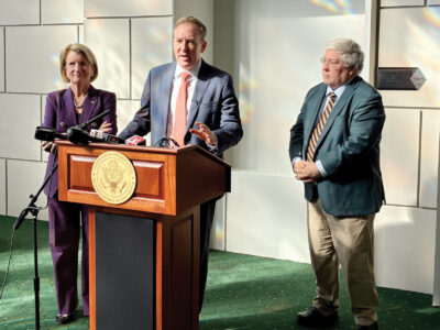 EPA Administrator Lee Zeldin, center, takes questions Wednesday at a press conference at the Robert C. Byrd Courthouse in downtown Charleston. He was joined by U.S. Sen. Shelley Moore Capito, left, and West Virginia Gov. Patrick Morrisey, right. (Photo by Steven Allen Adams)