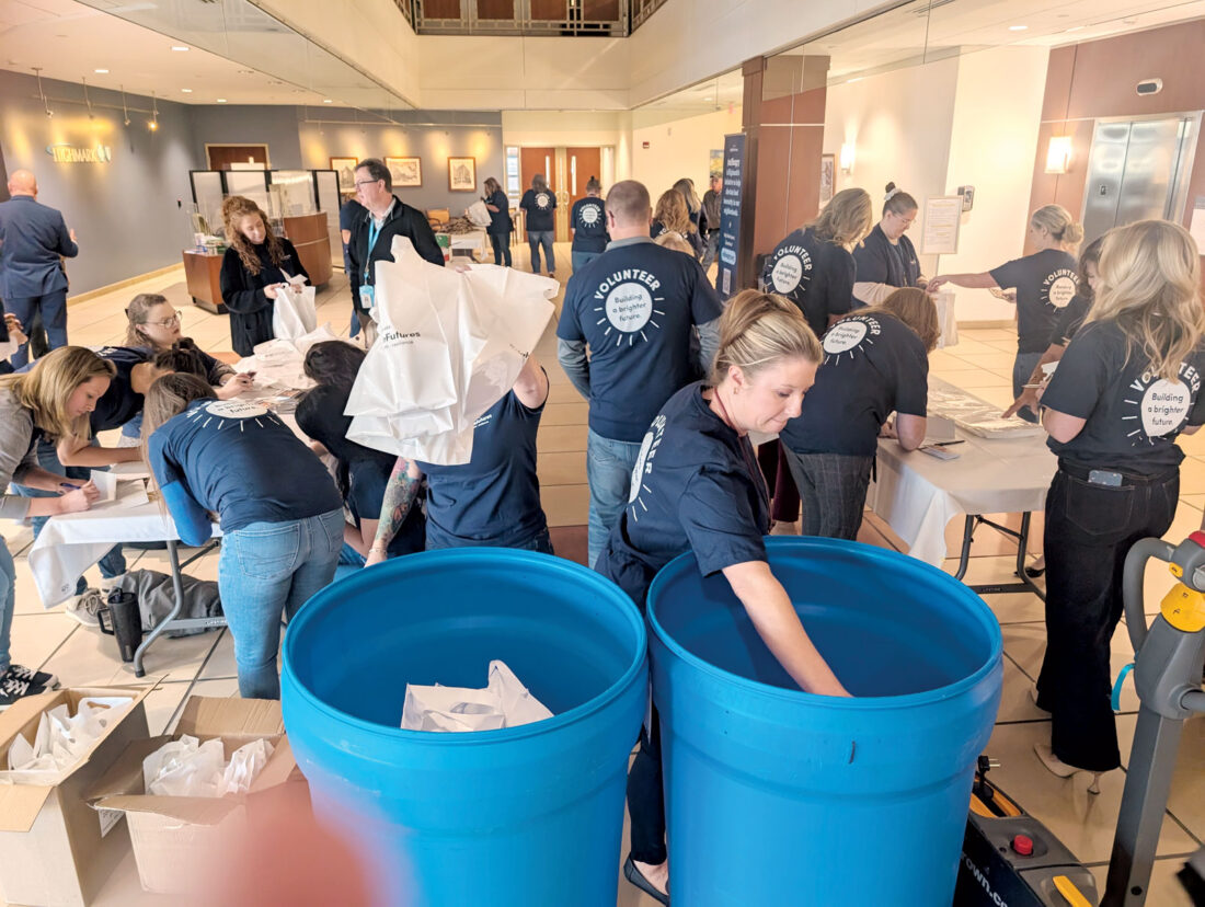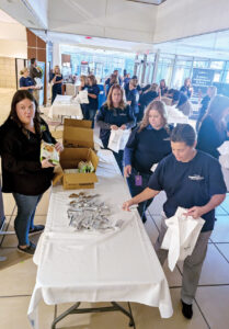 Highmark employees gather items to place in snack bags for Mountaineer Food Bank’s Veterans Table program Wednesday at the company’s West Virginia corporate headquarters in Parkersburg. Highmark also announced its (un)Hungry campaign to fight food insecurity. (Photo by Evan Bevins)