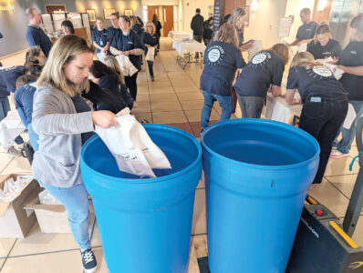 Ashley Snyder, client services manager at Highmark, places snack bags for Mountaineer Food Bank’s Veterans Table program in a barrel Wednesday at the company’s West Virginia corporate headquarters in Parkersburg. Highmark also announced its (un)Hungry campaign to fight food insecurity. (Photo by Evan Bevins)