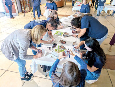 Highmark employees sign holiday greeting cards to include with snack bags for Mountaineer Food Bank’s Veterans Table program at the company’s West Virginia corporate headquarters in Parkersburg. Highmark also announced its (un)Hungry campaign to fight food insecurity. (Photo by Evan Bevins)