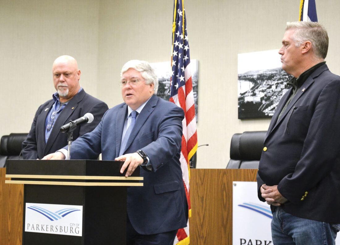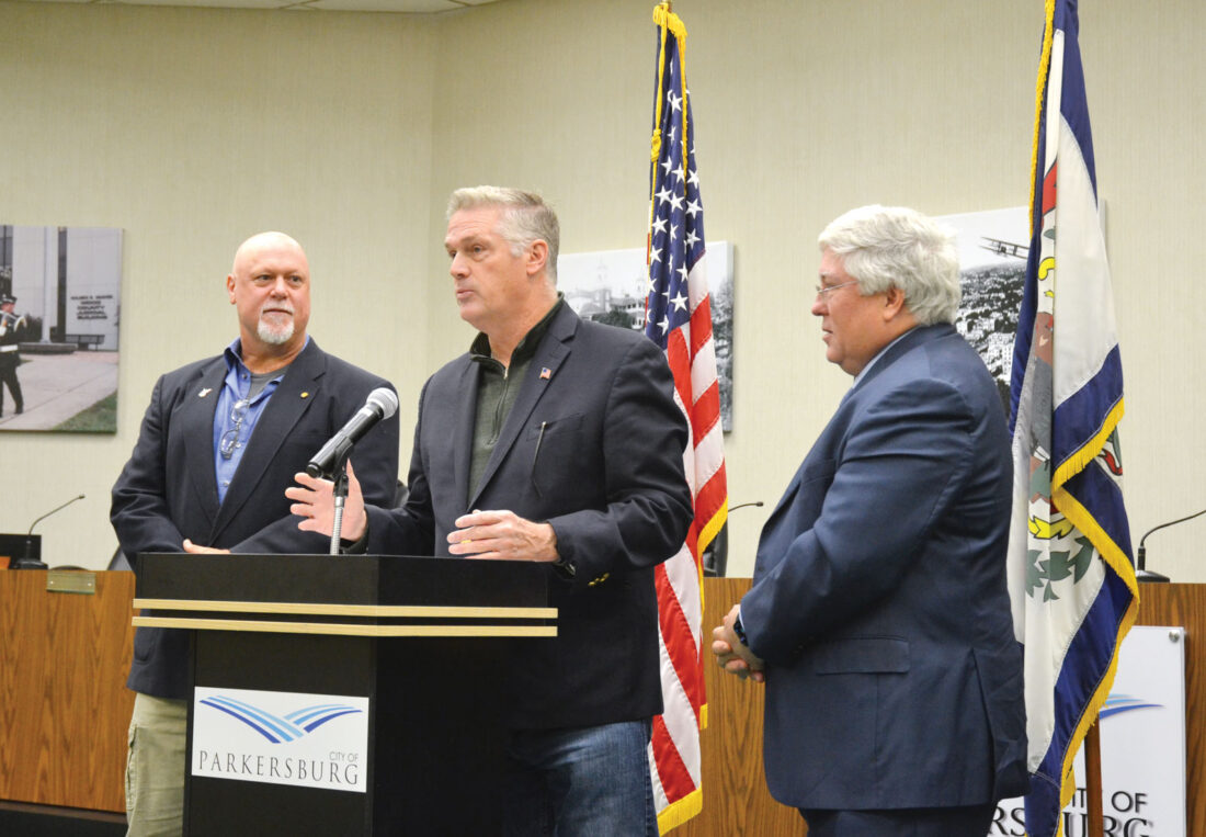Flanked by Del. Dave Foggin, R-Wood, and State Sen. Mike Azinger, R-Wood, Gov. Patrick Morrisey announced in Parkersburg Thursday that the state is investing $4.2 billion into energy, with only $1 million coming from state funds. Morrisey said these investments will create over 4,200 new jobs. (Photo by Douglass Huxley)