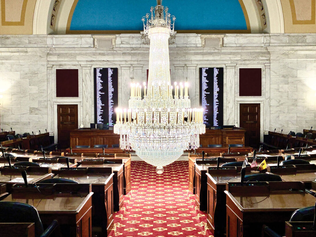 - The chandelier in the House of Delegates chamber is lowered for its annual cleaning in preparation for the 2026 legislative session in January. (Photo by Steven Allen Adams)