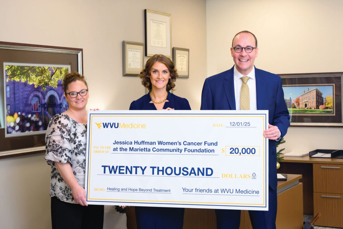 MARIETTA — West Virginia University Health System President and CEO Albert Wright presented a check this week for $20,000 to the Jessica Huffman Women’s Cancer Fund at the Marietta Community Foundation.