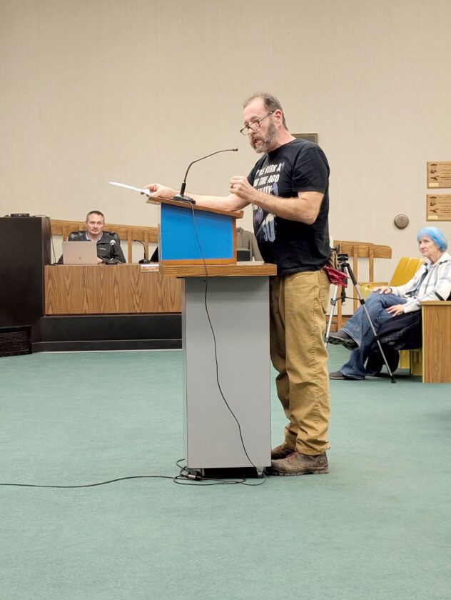 - Parkersburg resident Brian Hayden speaks during a special Parkersburg City Council meeting about a proposed subscription-based recycling service Tuesday in council chambers. (Photo by Evan Bevins)