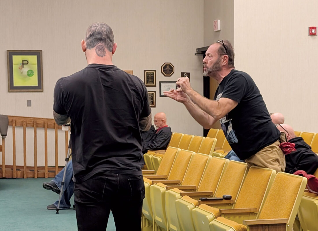 Parkersburg resident Brian Hayden, right, disagrees with Parkersburg City Council President Andrew Borkowski, not pictured, during a special council meeting Tuesday on a subscription-based curbside recycling program as Michael Bowman films for his online programming. (Photo by Evan Bevins)