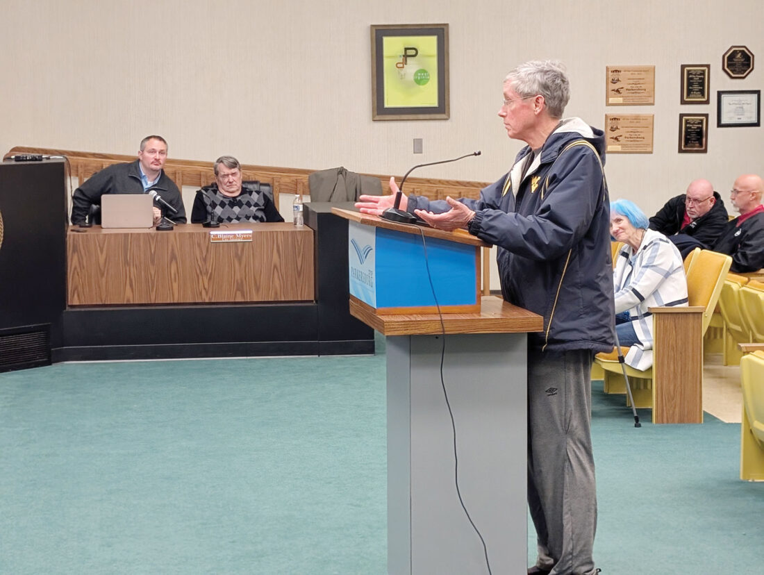 - Parkersburg resident Walt Auvil expresses his objection to the city’s proposed subscription-based curbside recycling program during a special Parkersburg City Council meeting Tuesday at the Municipal Building. (Photo by Evan Bevins)