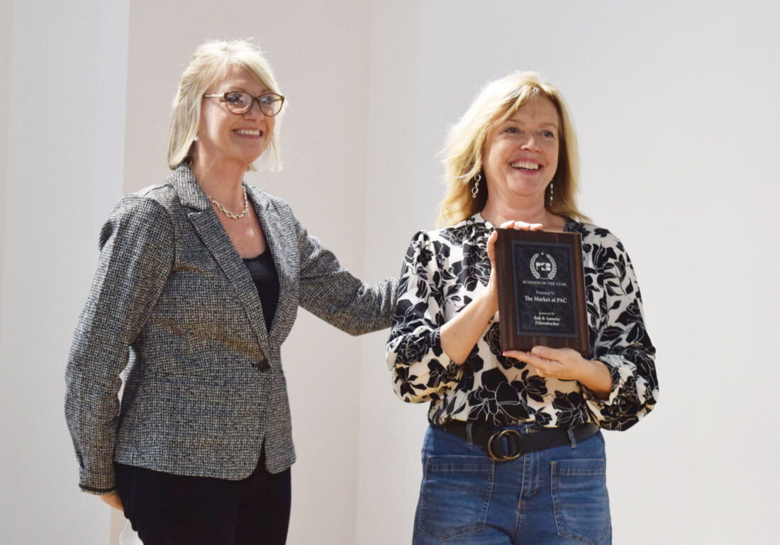 - Left, Downtown PKB Executive Director Amanda Stevens awards The Market at Parkersburg Art Center Managing Director Jessie Siefert, right, for the Business of the Year award during the Downtown PKB Annual Meeting Wednesday. (Photo by Amber Phipps)