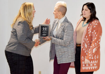- Downtown PKB Board Secretary Wendy Shriver accepts Person of the Year award from members of West Virginia University at Parkersburg Foundation during the Downtown PKB Annual Meeting Wednesday. (Photo by Amber Phipps)