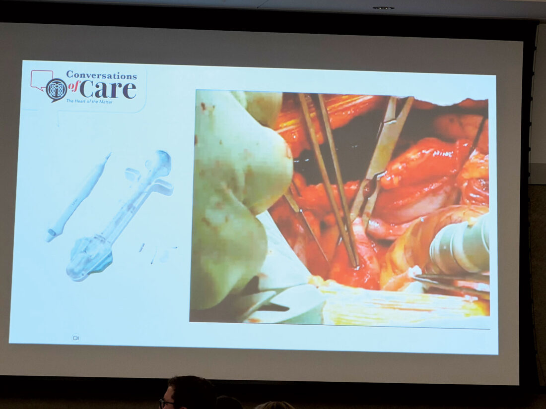 An image of a heart surgery procedure during Dr. Geoffrey Cousins presentation for Memorial Health Foundation’s event series Conversations of Care Friday afternoon. (Photo by Amber Phipps)