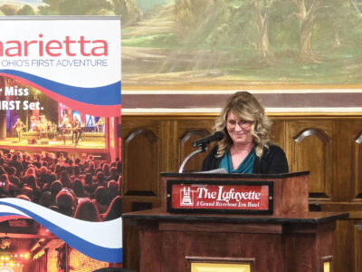 - Marietta-Washington County Convention & Visitors Bureau Board President Cheri Seevers welcomes guests to the CVB’s annual meeting on Tuesday at the Lafayette Hotel. (Photo by Gwen Sour)