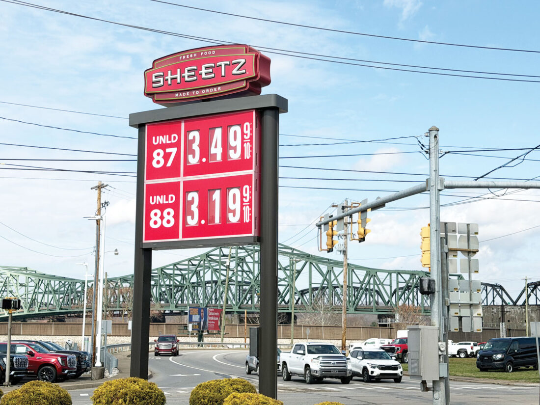 - Sheetz gas prices on display with the Parkersburg Belpre Bridge in the distance Friday. (Photo by Amber Phipps)