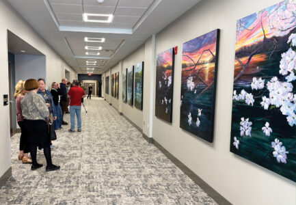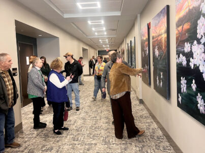 People look at a 12-piece art installation unveiled Tuesday at the Wood County Resiliency Center. Created by artists Belinda Armstrong and Virginia Killian with the Parkersburg Art Center, it’s titled “Reflections” and takes viewers through the four seasons that residents along the Ohio River in West Virginia experience. Resiliency Center Director Sydney Weber said Armstrong and Killian “put in countless hours” on the project and thanked them for their work. (Photo Provided)
