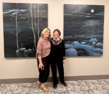 Jessie Siefert, managing/education director at the Parkersburg Art Center, poses for a photo Tuesday with her mother, Virginia Killian, in front of part of the 12-piece art installation, “Reflections,” Killian created with fellow artist Belinda Armstrong to be displayed at the Wood County Resiliency Center. (Photo Provided)
