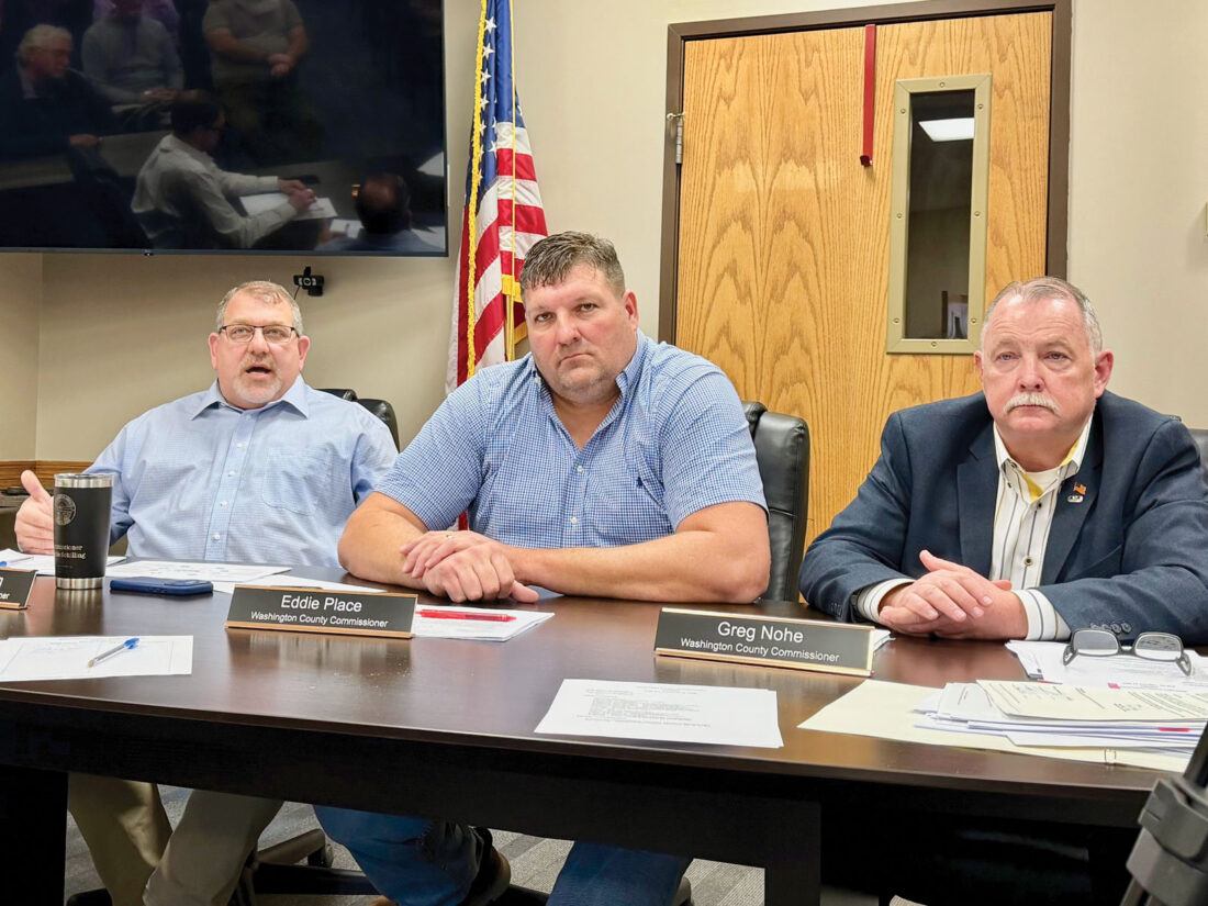 Washington County Commissioner Charlie Schilling, left, responds to Waterford residents regarding the preliminary data center project during the commission’s regular meeting Feb. 12. Commissioners Eddie Place and Greg Nohe listen and respond as well. (File Photo)