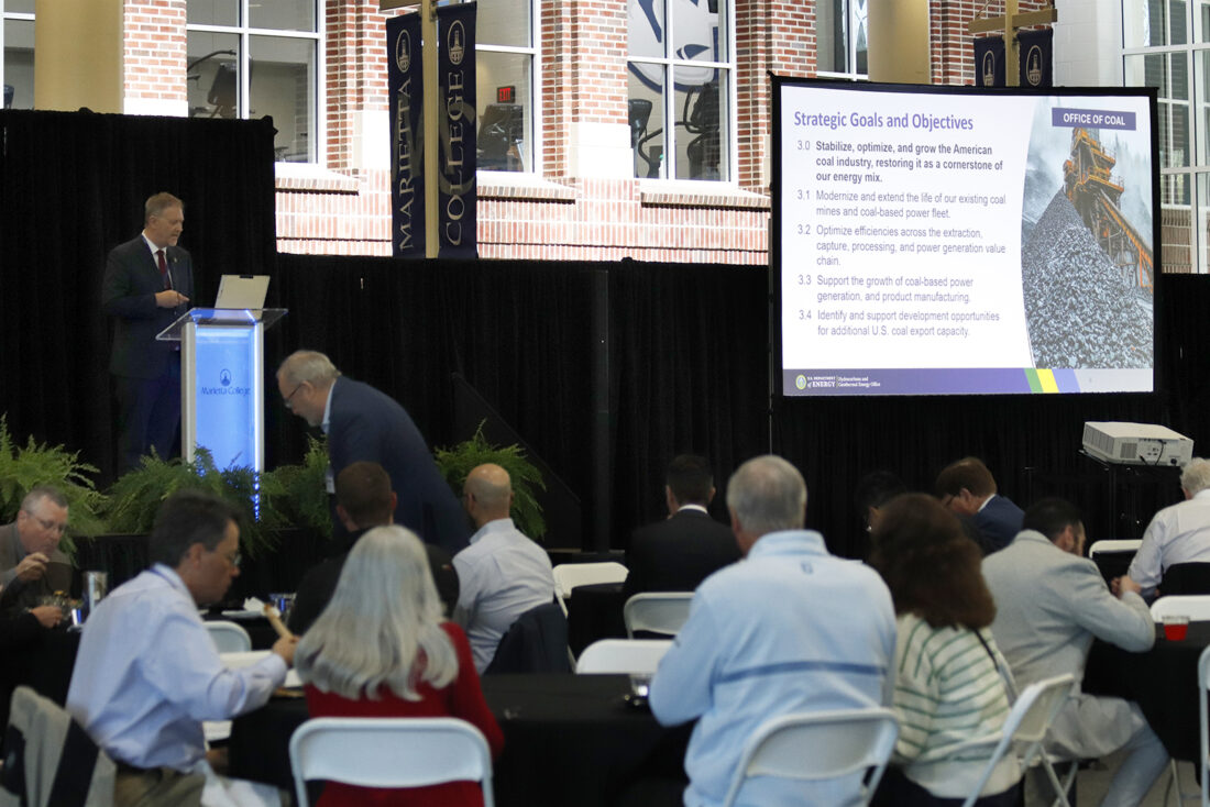 U.S. Department of Energy Deputy Assistant Secretary Subsurface Energy John Lassek delivers a presentation at the Center for Earth, Energy & Environment Symposium while attendees enjoy lunch Tuesday afternoon at Marietta College. (Photo by Gwen Sour)