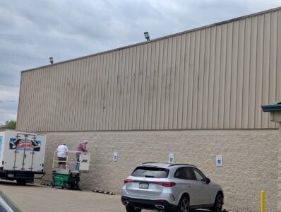 - Kajun Cassin, left, and Glen Lovejoy hang a banner on the newly christened Market on Emerson Monday after the Piggly Wiggly sign was removed last week. (Photo provided)