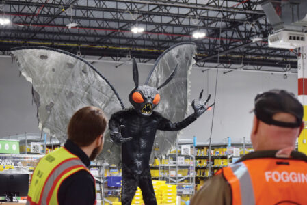 - Mothman looms over the visitors at the Amazon facility in Davisville during a tour on Tuesday. (Photo by Amber Phipps)