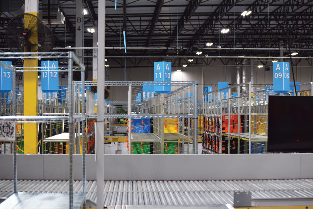 A section of the Davisville Amazon facility with marked aisles for associates to categorize packages. (Photo by Amber Phipps)