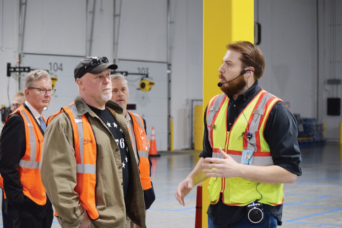 - Amazon site manager Curtis Jones, right, speaks to visitors during a tour of the facility in Davisville Tuesday. (Photo by Amber Phipps)