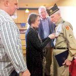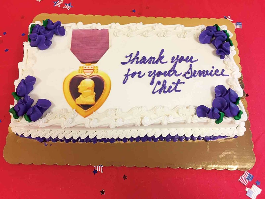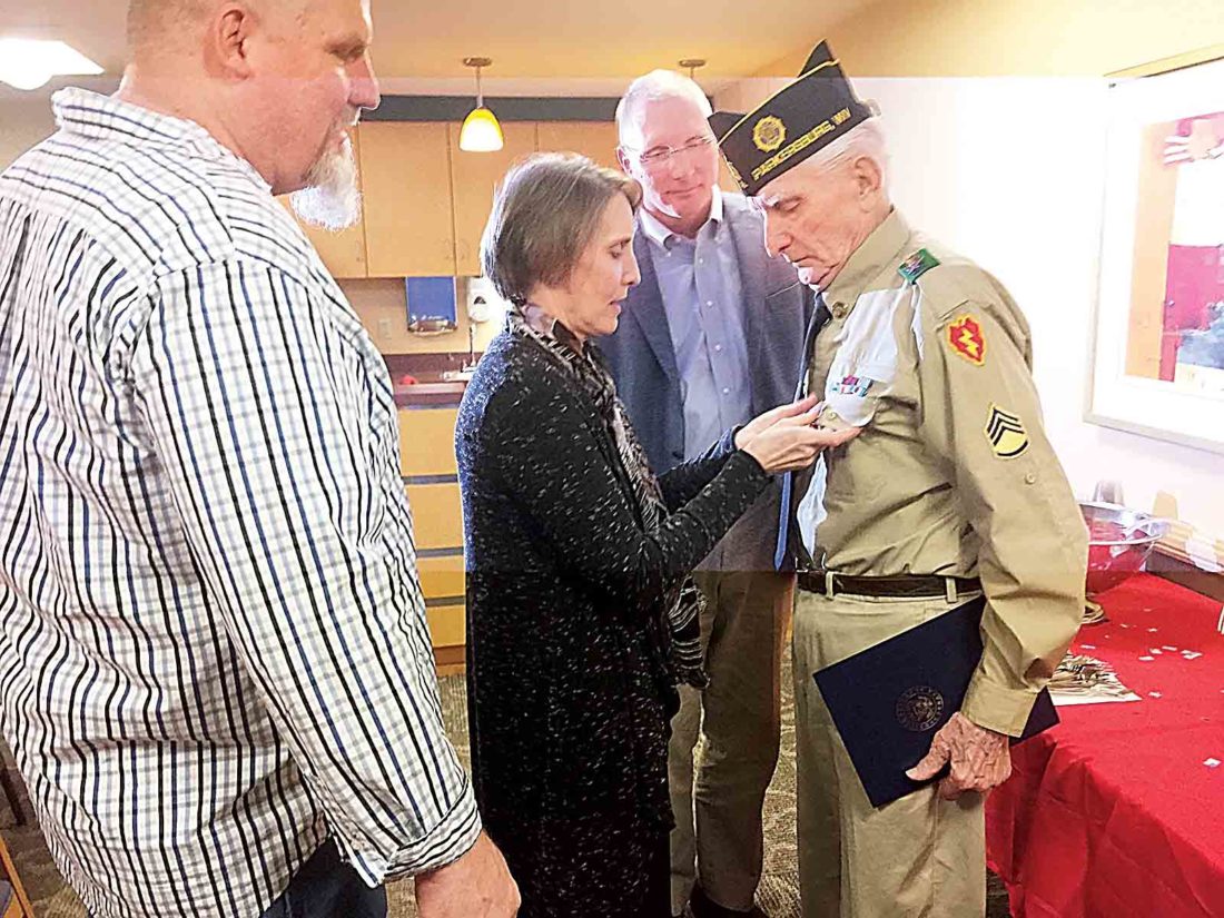 Photo Provided Beth Ostrowski Hundman pins the Purple Heart on her father, Chet Ostrowski, as her brothers Eric Ostrowski and Paul Ostrowski look on.