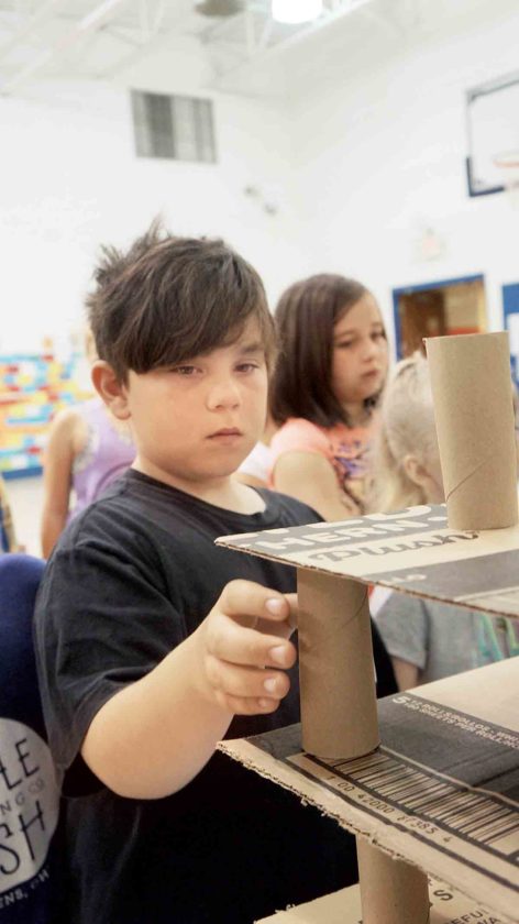 Fifth-grader Hollie Smith, 11, said her group created the “Tumbling Towers” activity station, which used pieces of cardboard and cardboard tubes to create buildings. Students were challenged to remove tubes without causing the structure to collapse.