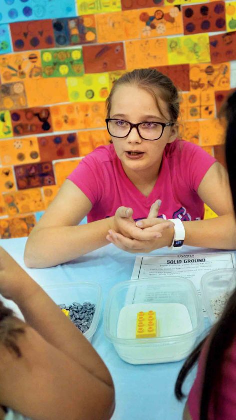 Fifth-grader Roxie Sprague, 10, challenged students to think about what foundation would best support a LEGO Duplo brick representing a house.