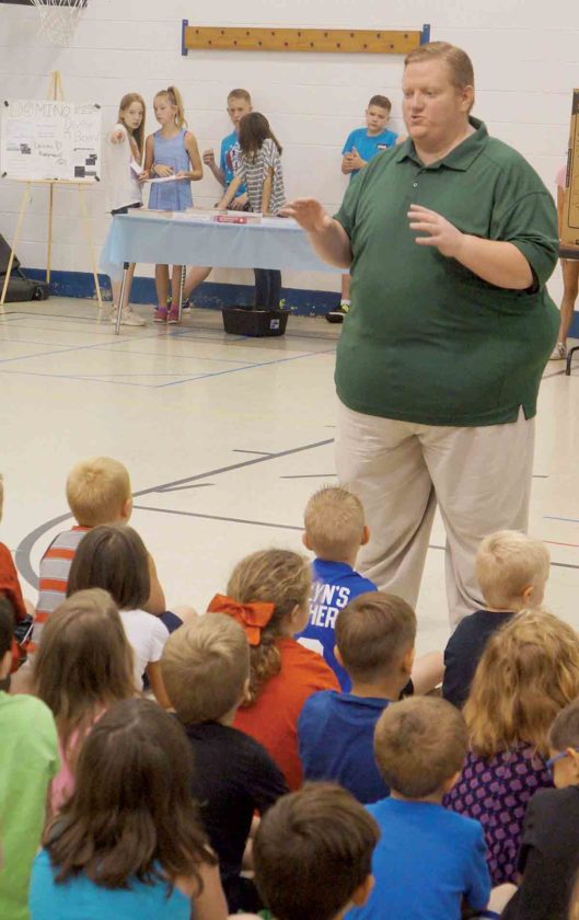 Blennerhassett Elementary School fifth-grade teacher Holmes Marty speaks to a group of students Monday during the school’s second-annual STEM Day, which featured nine student-run activity booths. (Photo by Michael Erb)
