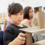 Second-grader Anthony Hall carefully removes a cardboard tube from a tower to see whether it can remain standing without the tube’s support as part of the “Tumbling Towers” activity station. (Photo by Michael Erb)