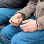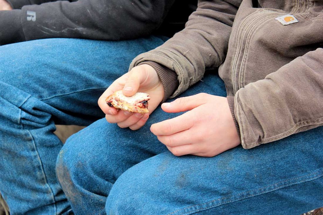 Photo by Janelle Patterson A camper at Ohio Wilderness Boys Camp pauses in eating a peanut butter and jelly sandwich Friday as his group forgoes a hot meal in order to discuss and unpack a behavioral issue that day.