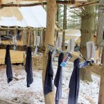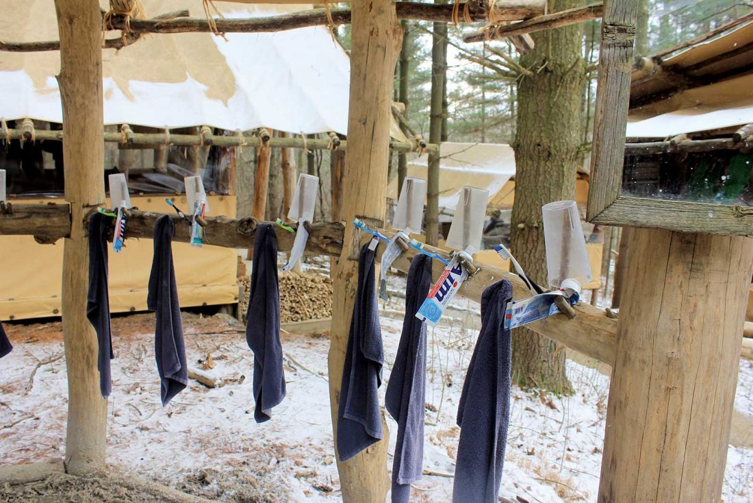 Photo by Janelle Patterson Toothbrushes, washcloths and cups remain near the Discoverers’ water source at their base camp Friday, held up with a peg system in the pine tent structure.