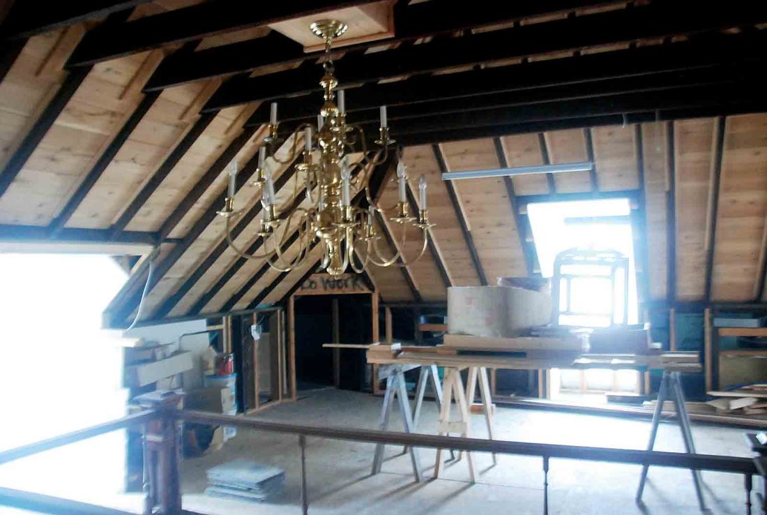 - A chandelier hangs in the unfinished attic of 1209 Ann St., Parkersburg. (Photo by Evan Bevins)