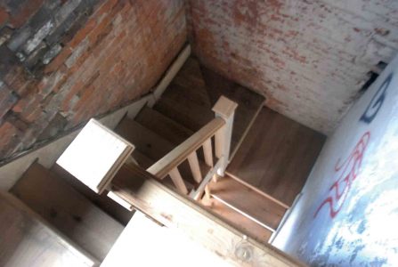 - An unfinished staircase is shown in the Van Winkle-Standard Oil house on Ann Street in Parkersburg. (Photo by Evan Bevins)