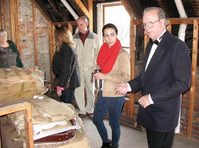 - Julia-Ann Square Historic District resident Bob Francis looks into the unfinished attic area of the Castle at 1209 Ann St., Parkersburg, on Oct. 25. Francis has been taking care of the property and doing some interior repair work at the structure for its owner, Standard Oil. (Photo by Evan Bevins)