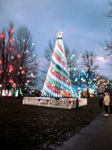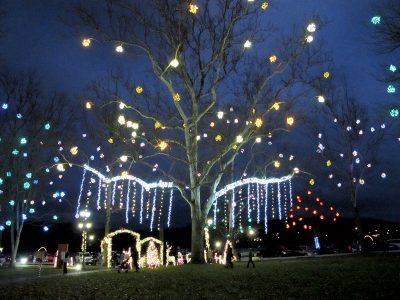 The lights on the Christmas tree at the entrance to Gallipolis City Park is timed to Christmas music in the annual Gallipolis in Lights display. Thousands of lights hang from trees and branches, creating a visually appealing walk through the downtown park. (Photo by Jess Mancini)