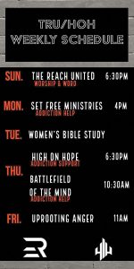 On Sunday evenings, they will offer worship and word; Mondays is addiction help; Tuesday is their women’s Bible study and addiction support; Thursday is addiction help and Friday is uprooting anger.