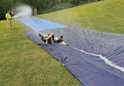 After running through the woods, runners slid down a hill covered with a slippery tarp to enter an obstacle course just before the finish line. (Photo by Madeline Scarborough)