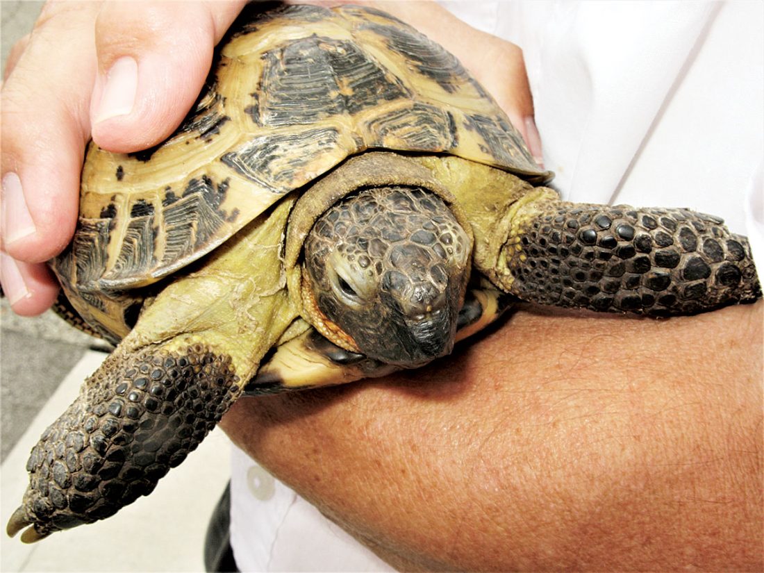 - Ivan the Russian tortoise is at home on Ray Swick’s arm. Swick is looking for a permanent female mate for Ivan, who appears to be affected by the lack of companionship. (Photo by Jess Mancini)