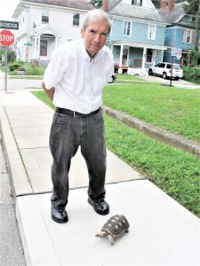 Ray Swick holds Ivan, his pet Russian tortoise. Swick is trying to find a female mate for Ivan and can be reached at burrsman@gmail.com. (Photo by Jess Mancini)