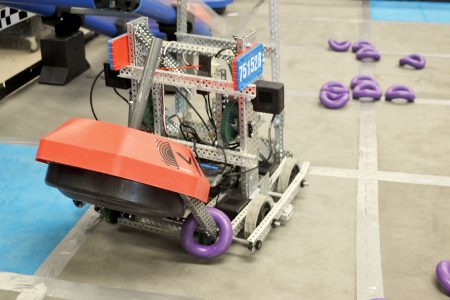 He also briefly explained how points are scored. Each team gets one minute each for the driver’s skills and the autonomous runs. Points are accumulated after both runs are completed. There are various objects that need to be picked up by the robot, and some ramps they have to climb, like a see-saw.